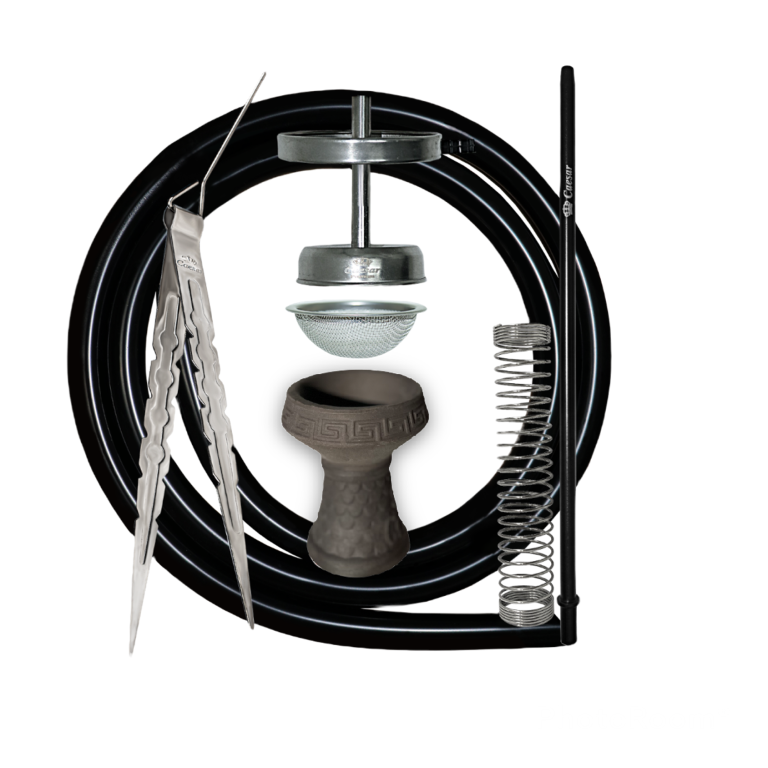 Complete set: Glass base, Down stem, Base Stem, Hose silicone, Handle, Ceramic Bowl, Tray and tongs for coal.